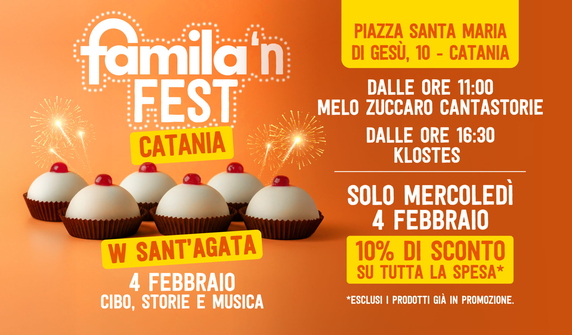 🛒Martedì 4 febbraio il Famila’n Fest in piazza Santa Maria di Gesù sarà un’occasione per tutta la famiglia: dalle 9 alle 18:30 circa, degustazioni gratuite, intrattenimento, omaggi per i più piccoli, le storie catanesi narrate da Melo Zuccaro, le note mediterranee delle Klostes e… il 10% di sconto sulla spesa!