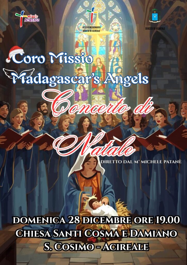 Quarta tappa del tour natalizio del Coro Missio Madagascar’s Angels nelle diverse parrocchie della Diocesi di Acireale. Domenica 28 Dicembre appuntamento alle ore 19.00 nella Parrocchia Santi Cosma e Damiano – S. Cosimo -Acireale per il Concerto di Natale.