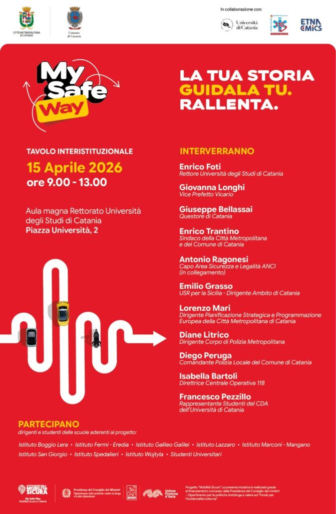 Oltre 800 studenti coinvolti, 346 controlli su strada effettuati e 56 violazioni accertate: sono questi alcuni dei numeri del progetto “My Safe Way – La tua storia guidala tu. Rallenta. Mobilità sicura a Catania”, che si avvia alla conclusione con il tavolo interistituzionale in programma mercoledì 15 aprile 2026, dalle ore 9:00 nell’Aula Magna del Rettorato dell’Università degli Studi di Catania.