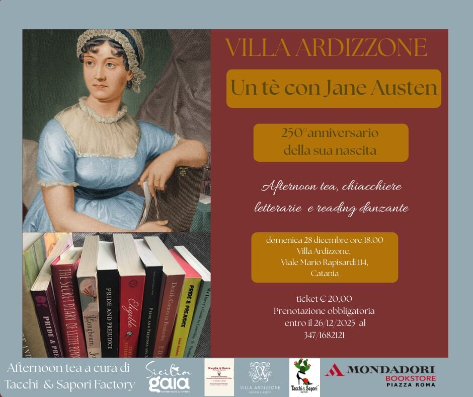 Domenica 28 Dicembre alle ore 18:00, Villa Ardizzone, a Catania, ospiterà l’evento dal titolo “Un tè con Jane Austen- 250°anniversario della sua nascita”.