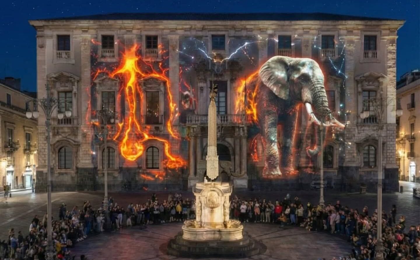 A Catania, Piazza Duomo si illumina con il video mapping su Eliodoro e il Liotru, regalando a cittadini e turisti un’atmosfera magica e natalizia.